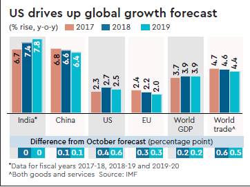 The US recently announced the biggest tax cuts in 30 years, bringing the corporate tax rate down from 35% to 21%. Lower corporate tax and likely interest rate hikes by the Federal Reserve could draw investors from all over the world to the US. The IMF has revised up the prediction for the US by 40 basis points to 2.7% for 2018, against 2.3% last year. It has raised its projection for the EU by 30 basis points to 2.2% for 2018. The current cyclical upswing in global growth offers an ideal opportunity for structural reforms. On the upside, the cyclical rebound could prove stronger in the near term as the pickup in activity and easier financial conditions reinforce each other, the multilateral body said.