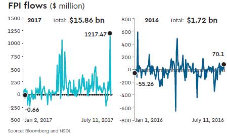 “From an overseas investor perspective, our currency and fixed income macros are looking good this year — oil prices have stayed low, inflation is under control, reforms in the form of GST continued, prospects for political stability have improved after UP election results. This has resulted in the FPI money coming in — both in equity and in debt,” Narayan said.