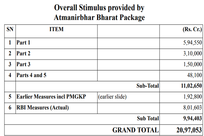 The announcements made by the Finance Minister Nirmala Sitharaman on Sunday concluded the relief measures undertaken in five tranches by the government as part of the economic package announced by PM Modi for ‘Atmanirbhar Bharat’. The minister, towards the end of her speech, also provided a tranche-wise complete break-up of the stimulus. Importantly, the overall package which stood at Rs 20,97,053 crore, included the Rs 1.92 lakh crore stimulus from measures announced by Modi recently such as the Pradhan Matri Garib Kalyan Package worth Rs 1.7 lakh crore. A big chunk, in fact the largest, worth Rs 8.01 lakh crore of the economic package belonged to the various measures by the Reserve Bank of India in February, March and April this year to inject liquidity. Below is the complete break-up of the package launched to make India ‘self-reliant’ amid and post Covid times.