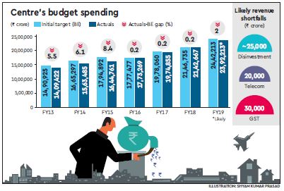 Its efforts to keep public spending robust notwithstanding, the Centre may have to trim the annual budgetary expenditure for the current financial year by Rs 50,000 crore, or 2% from the estimated level, and the axe could fall primarily on defence and some social-sector spending. Trimming of the budget to meet the tough fiscal deficit target of 3.3% of the GDP for FY19 has been necessitated because non-tax revenues could be significantly below budget target and uncertainties over indirect tax receipts, even though the government’s public assertions so far have been that the aggregate tax receipts would be in line with the budget.