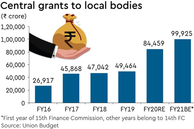Currently, roughly 60% of the revenue of municipal bodies in the country — about 8,000 in number — comes from devolution by the Centre and states.