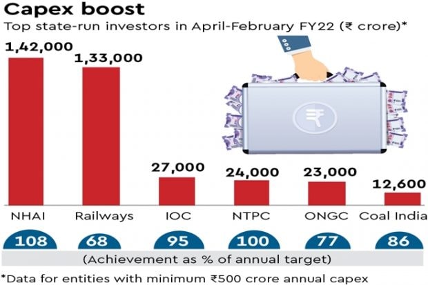 The National Highways Authority of India (NHAI) was the top investor with a capex of Rs 1.42 lakh crore, or 108% of its FY22 target, in April-February. Indian Railways was lagging behind NHAI as it achieved 68% of the FY22 target of Rs 1.95 lakh crore in the first eleven months of the year.