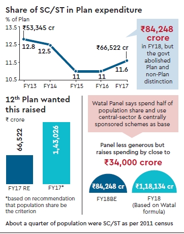 The Centre’s Budget allocations for scheduled castes and tribes’ (SC&ST) welfare could leapfrog 40% if a “new arrangement” proposed by a high-level committee is put in place. The Ratan P Watal committee has recommended that, of the Centre’s scheme funds, SC/ST wellbeing be allocated not less than what corresponds to half of their numerical strength to the country’s total population, official sources told FE. The panel was asked to propose a new formula in this regard given that the practice of Five-year Plan allocations has been dispensed with. In the 12th Plan period (FY13-17), SC/ST welfare was supposed to receive Plan funds commensurate with these communities’ population, though it actually did not. Although the panel has halved mandatory share, if its proposal is implemented, SC/ST welfare will receive higher outlays because the disbursal is to be made from a much larger pool than Plan funds, namely the “central-sector and centrally sponsored sponsored schemes”. These schemes’ budget outlay for the current financial year is `9.45 lakh crore, up 65% from the Plan budget in FY17.
