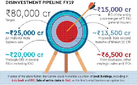 While the Centre is poised to mop up a whopping Rs 1 lakh crore from disinvestment in FY18, the target of Rs 80,000 crore for the next year is challenging, as the pipeline is modest and markets have become volatile. Besides the privatisation of Air India-Air India Express (AI-AIE) combine, the second tranche of Bharat 22 ETF and listing of the entity to emerge out of the merger of three PSU general insurers and several offers for sale (OFSs) are what the government is banking on.
