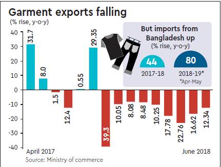 As such, India’s garment imports from Bangladesh jumped 44% to $201 million last fiscal from a year before and 80% in the first two months of 2018-19, despite the fact that India is a large manufacturer of apparel. The rise in imports comes at a time when India’s own garment exports have been dropping month after month since October 2017. Consequently, despite a relatively good performance by certain textile segments, India’s overall textile, garment and allied product exports eased 0.5% in the first quarter of this fiscal to $9.31 billion.