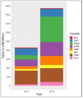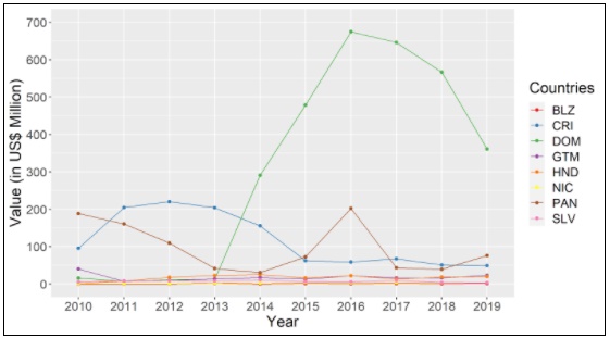 In 2019. The value of India’s Exports was almost double the value of India’s Imports from SICA Countries. Since 2010, the volume of Trade between India and SICA has almost doubled, reaching nearly US$ 1.75 billion. Mainly due to a high increase in the percentage of India’s Trade volume with Dominican Republic (484.51%), El Salvador(180.62%), Nicaragua(123.29%), Guatemala(105.49%) and Honduras(217.23%) that has been observed between 2010 and 2019, while the Trade Volume with Costa Rica (11.70%), Panama(0.53%) and Belize(4.77%) has more or less remained the same between 2010 and 2019. Trade between India and Central America has grown over the years; however, it is far from reaching its potential. This potential can only be obtained if the restrictions on trade are lifted by policies that would lower tariff and non-tariff barriers and increase productivity levels in the cost of transportation.