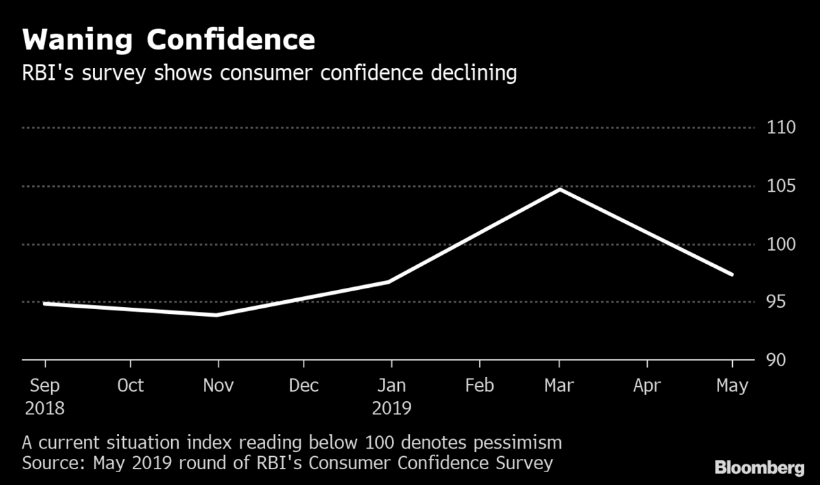 Consumer confidence in India dropped in May, as people fretted about jobs and slowing growth in Asia’s third-largest economy. The current situation index fell to 97.3 from 104.6 in March, according to the Reserve Bank of India’s consumer confidence survey, where 100 is the dividing line between pessimism and optimism. The future expectations gauge fell to 128.4 in May from a record 133.4, suggesting waning optimism.