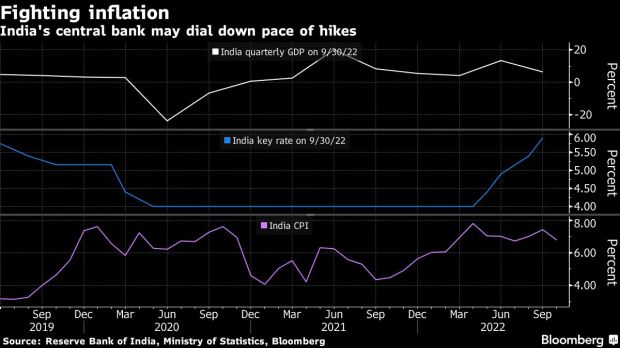 India’s central bank will probably start slowing the pace of interest-rate increases on Wednesday, signaling it’s near the end of its aggressive tightening cycle. After 190 basis points of rate increases this year, including three half-point moves, the six-member Monetary Policy Committee led by Governor Shaktikanta Das has more than one reason to switch to smaller increments: inflation is coming off a high and headwinds to economic growth are increasing.