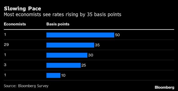 Twenty-nine of 35 economists in a Bloomberg survey predict the benchmark repurchase rate will be raised by 35 basis points, three see a quarter-point move, while one each expect a 10-, 30- and 50-basis-point action.