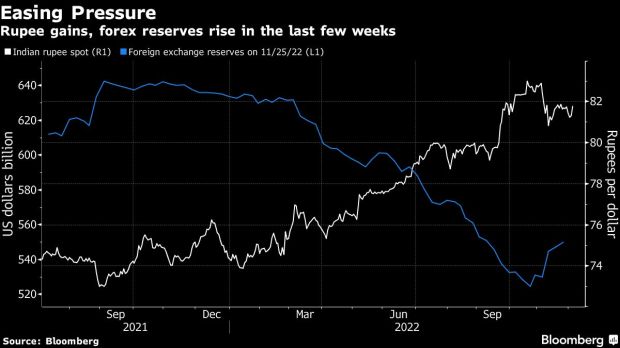 India’s foreign exchange reserves have climbed over $20 billion in the last three weeks to $550.14 billion as of Nov. 25, giving the central bank more control over the exchange rate. The rupee saw its first monthly gain this year in November.