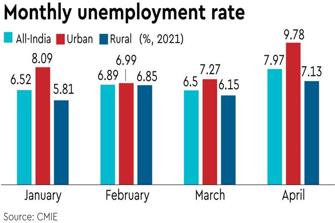 Covid-induced lockdowns and restrictions on mobility have pushed India’s unemployment rate to a four-month high of 7.97% in April compared with 6.5% in March, 6.89% in February and 6.52% in January this year, data compiled by Centre for Monitoring Indian Economy (CMIE) showed.
