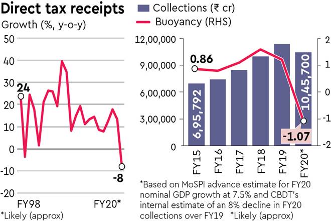 In fact, the recent Budget had revised the FY20 growth target for these taxes to 2.9% from the initial 17.5% (budget estimate). How the government’s tax estimates are going awry is evident from the fact that FY20 direct tax receipts are now going to be around Rs 10.46 lakh crore, down 22% from the BE of Rs 13.35 lakh crore, or Rs 90,000 crore or 8% less than the revised estimate of Rs 11.7 lakh crore.