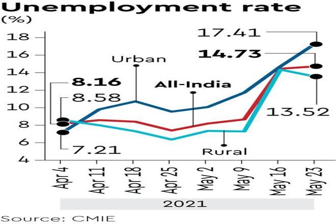 Overall unemployment rate has also significantly increased since the beginning of the second Covid wave to stand at near one-year high of 14.73% for the week ended May 23 against 8.16% on April 4. During the same period, rural unemployment rate rose to 13.52% from 8.58%, even though it softened a bit from 14.34% recorded in the week ended May 16.