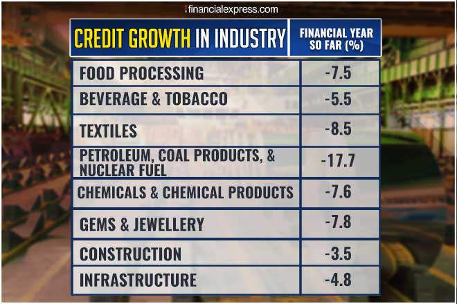Credit growth in textiles contracted by 8.5 per cent; petroleum, coal products & nuclear fuel (17.7 per cent); basic metal & metal product (6.2 per cent); construction (3.5 per cent); and the credit growth in infrastructure shrank 4.8 per cent so far in this financial year.