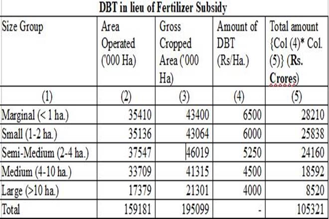 Cash transfer directly to the farmer in lieu of fertilizers at subsidised prices will benefit them as they would be empowered to choose the fertilizer combination best suited to their soil texture without the influence of the distorted price relatives of NPK. Given the gross cropped area (GCA) of 195.1 million hectares and that the Government has provided Rs 1,02,872 crores in B.E. 2019-20 (including Rs 22,876 crores approved on 31.07.2019) on account of fertilizers subsidy, average subsidy works out to Rs.5233/ha. If cash amount @ Rs. 5250/ha. is transferred in lieu of fertilizers subsidy to semi-medium farmers (middle group) and to others in a graded system, in inverse order of their land resources, it would have a total financial implication of Rs 1,05,321 crores (Table below).