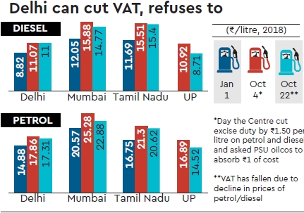 Even as Haryana and Uttar Pradesh have recently reduced value-added taxes (VAT) on petrol and diesel, the Delhi government hasn’t; the city state’s stubborn refusal to take a cue from the Centre (which cut excise by Rs 1.5/litre on October 4) is believed to have led to a sudden shift in fuel consumption to the two neighbouring states.