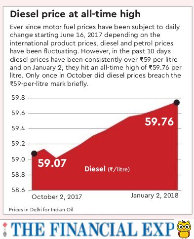 Since the government came up with the daily-price-revision rule for the motor fuel based on the international product prices, diesel and petrol prices have been fluctuating on a daily basis. Just talking about diesel, the prices have been consistently over Rs 59 per litre in the last ten days. The prices hit a high of Rs 59.76 per litre on Tuesday. It was only once in October that the diesel prices breached the Rs 59-per-litre mark briefly. State-owned oil companies sold diesel to retail consumers for Rs 59.70 a litre in Delhi on Monday at the highest ever price in the city. In Kolkata and Chennai, diesel prices were the highest since September 2014. In Mumbai, prices were the highest since March 2017. The prices of petrol in Delhi, Mumbai, Chennai, Kolkata and many other cities were the highest since October 3, 2017, when the central government decided to slash excise duty by Rs 2 on petrol and diesel to shower some relief on the consumers. In the month of October, the government directed companies to stop monthly hikes in prices of cooking gas. Earlier the government effected monthly hikes with an aim to eliminate subsidy on cooking fuel.