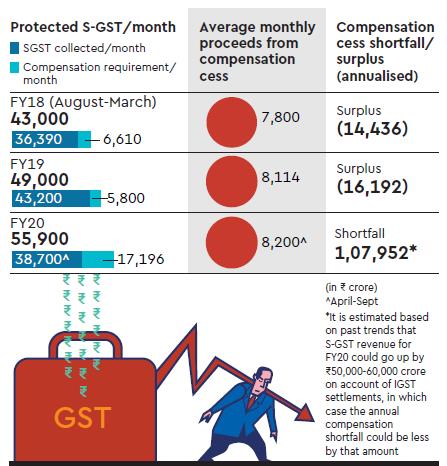 The sharp decline in Goods and Services Tax (GST) collections could not only add to the Centre’s fiscal woes, but also deprive state governments of their assured compensation for revenue shortfall. If the collections till September are to be gone by, the compensation cess kitty will fall short by Rs 1,08,000 crore over FY20 (about Rs9,000 crore/month), denting the states’ coffers.