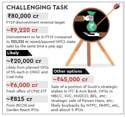 With only Rs 9,220 crore or a little over 11% of the annual disinvestment target achieved so far, the Centre has lined up a plan to conclude a series of stake sales by November-end, as it aims to exceed the FY19 disinvestment target of Rs 80,000 crore. The window is critical for stake sales as markets could become feverish in the fourth quarter of FY19, ahead of general elections in April-May.