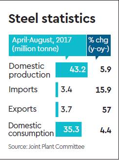 The policy favouring domestically manufactured iron and steel was approved by the Cabinet in May this year “with objective of nation-building and encouraging domestic manufacturing”. Providing cushion to the struggling domestic steel industry from burgeoning imports was another reason for formulating the policy. Since the beginning of last year, the steel ministry has come to the aid of the domestic steel industry, providing it with both tariff and non-tariff protections including anti-dumping duty on a host a products. As a result, India’s import of steel declined by over 36% to 7.4 million tonne (mt) in 2016-17. During the April-August period of the current fiscal, imports grew by 16% to 3.45 mt; some of the protective measures like minimum import price were withdrawn. Attempts are also being made by the steel ministry to ensure steady supply of iron ore at cheaper costs to steel units, though these haven’t been successful, following strong objection from miners and the mines ministry.