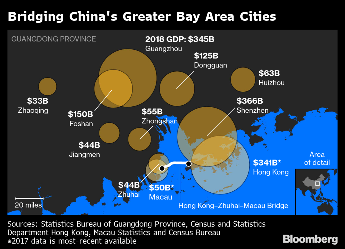 Hong Kong, Macau, Shenzhen and Guangzhou will be the four key Bay Area cities, driving the region’s economic development, according to the blueprint. HSBC Holdings Plc has estimated the region — with more than 67 million residents — would boast a trillion-dollar economy and eclipse Japan as the world’s fourth-largest exporter.