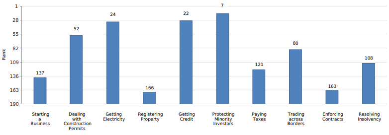 The World Bank’s Doing Business report assesses 190 economies on ten parameters — starting a business, dealing with construction permits, getting electricity, registering property, getting credit, protecting minority investors, paying taxes, trading across borders, enforcing contracts and resolving insolvency.
