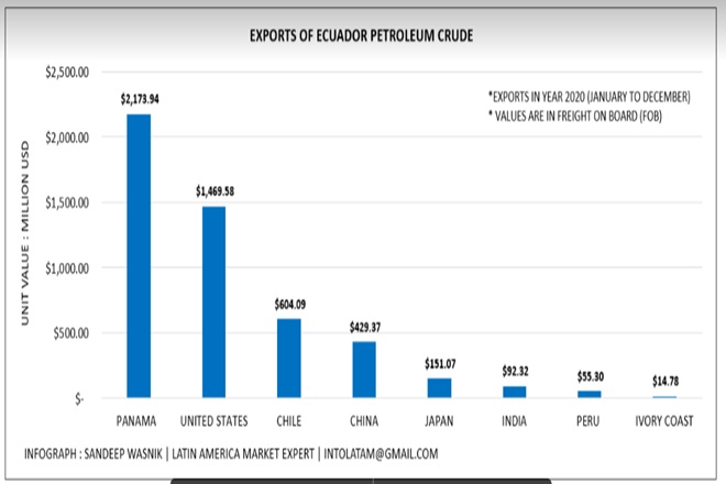 In 2020 (Jan-Dec), The exportation of Ecuadorian Crude Petroleum recorded$4.99 billion(Exact figure – $4990445689,FOB Value), where Panama recorded top most importing of Crude Petroleum with a value of $2,173.94 million, followed by United States ($1,469.58 million), Chile ($604.09 million), China ($429.37 million), Japan ($151.07 million), India ($92.32 million), Peru ($55.30 million) and the Ivory Coast ($14.78 million).In India, Reliance Industries Limited and Nayara Energy Limited are the two principal refineries importing Ecuadorian Crude Petroleum.