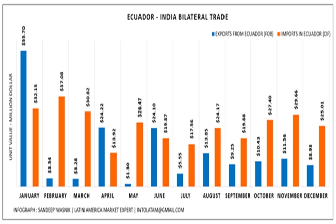 India and Ecuador established official diplomatic relations in 1969, also both countries signed several bilateral agreements on corporation in education sector (2006), agriculture (2008), and economic co-operation (2013). Both countries also signed a Protocol on Joint Economic and Trade Committee (JETCO) in 9th of October, 2015 in New Delhi to strengthen the trade relations between the countries.On 17th May 2017, India-Ecuador (JETCO) first meeting was held and decided to explore the possibility of Trade Agreement through Joint Feasibility Study (JFS), where Terms of Reference for the JFS were approved and signed by both countries on 22nd May 2018. The infographics shows bilateral trade of Ecuador and India of year 2020 (January to December).