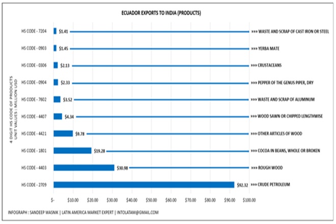 Ecuador exports nearly 88 types of products recorded value $171.71million (Exact figure – $171713343, FOB Value) in 2020 (January to December) to India, thetop ten product exportationare Petroleum Crude – $92.32 million followed by Rough Wood – $30.97 million, Cocoa Beans (Whole/Broken-Raw/Roasted) – $19.28 million, Other article of wood – $9.77 million, Wood Sawn – $4.34 million and others.