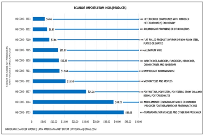 On the other hand, Ecuador imports nearly 1,223 types of products from India of value $303.94 million (Exact Value $303945359, CIF Values).The top most five product importation are motor cars and other motor vehicles principally designed for the transport of persons – $43.03 million, medicaments consisting of mixed or unmixed products for therapeutic or prophylactic uses, put up in measured doses – $38.20 million, polyacetals – $25.28 million, motorcycles – $15.49 million,unwrought aluminium – $12.67 million are shown.