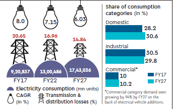 Electrical energy requirement in the next 10 years is expected to grow by 79%. The country will need 1,743 billion units (BU) of energy in the FY27. Energy requirement in FY17 was close to 1,142 BU. The report noted that energy efficiency schemes and aggressive demand side management would lead to savings of 206 BU in FY22 and 273 BU in FY27.