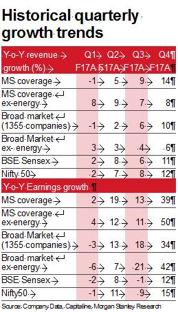Our analysts have built in a lot of negatives into their Q1FY18 estimates, and thus there is a higher chance of a positive surprise during the coming earnings season, in our view. They expect revenue and earnings growth of 12% y-o-y and 1% y-o-y, respectively, for the Morgan Stanley coverage universe. For the Morgan Stanley India coverage universe (122 companies), our analysts expect revenue and net profit growth of 12% and -1% y-o-y, respectively, in June 2017. They expect y-o-y margin compression of 214 bps. For Sensex companies, they expect revenue and profit growth of 8% y-o-y and 4% y-o-y in QE June 2017.