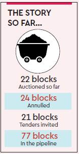 Following an amendment to the Mines and Minerals (Development & Regulation) Amendment Act, 2015, which made allocation of mines through auctions mandatory, 22 mines have been successfully auctioned, but 24 proposed auctions had to be annulled due to poor investors’ interest. Notice Inviting Tenders (NITs) for 21 mines have already been issued, 77 blocks are in the pipeline, a source in the mines ministry said.