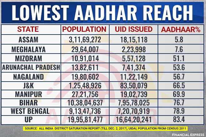Arunachal Pradesh (53.6%) and Nagaland (56.7%) complete the top 5. They are followed by Jammu Kashmir where 83,50,079 people have got their UIDs from a total population of 1,25,48,926.