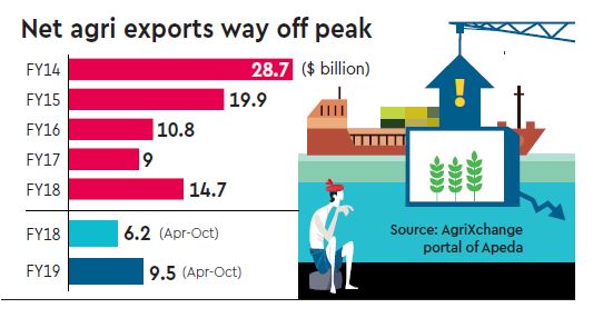 Supported by elevated global commodity prices, farm exports hit a record $42.8 billion in 2013-14, before witnessing a drop. Last fiscal, the agri exports reversed a three-year slide to post an over 14% rise to $38.2 billion. However, the growth again slowed down to just over 2% to $18.6 billion in H1FY19, trailing a double-digit rise in overall merchandise exports.