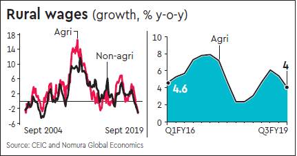 Wage growth for rural agricultural labourers slipped to four-quarter low of 4% in the third quarter of calendar year 2019, a Nomura report said, in what could cement the perception that a revival of the demand in the economy is getting delayed. The rural agriculture wage growth fell sharply from 5% in July to apparently negative territory in September, ahead of the Diwali season.
