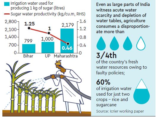 On Tuesday, the Centre hiked prices of ethanol, meant for blending with petrol, for 2019-20 to help cut surplus sugar production. The Centre is targeting to achieve 10% of ethanol blending with petrol by FY22 from about 7% in FY20. A working paper by Icrier last year (by Ashok Gulati and Gayathri Mohan) discussed the issue in detail and called for a paradigm shift in water use for agriculture, with the objective of shifting water-intensive crops to regions where the natural resource is abundant. Farmers in Maharashtra, despite the state’s abysmally-low irrigation coverage (18%), choose water-guzzling sugarcane over other crops like cotton, tur and groundnut which produce higher value of output per unit of irrigation water, the paper pointed out.