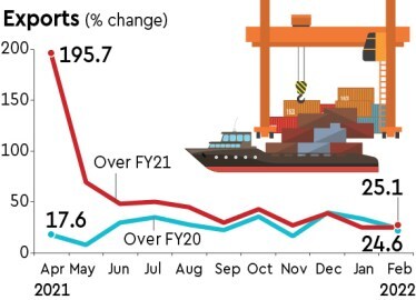 Given that the export between April and February hit $374.8 billion, up 46.1% from a year before, it is set to cross the ambitious $400-billion target set by the government for FY22 and reach about $410 billion. This is despite potential short-term risks to the global supply-chain from the Russia-Ukraine conflict, some exporters said. A spurt in demand for goods in the wake of an industrial resurgence in advanced economies and global commodity price rise have boosted exports this fiscal, after a Covid-induced slide in FY21.