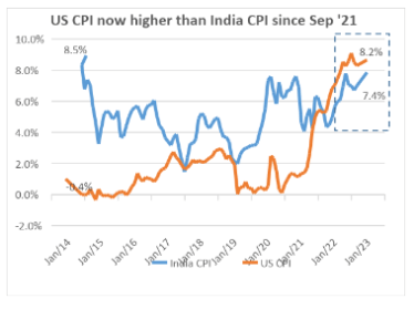 The lowest point of India’s CPI inflation in the pandemic era stood at 4% (Jan ’21), which is currently hovering at ~7%. The gap between India’s current inflation (7%) and the 6-year average (4.5%) is also not very high, compared to that of the US. Additionally, the RBI’s inflation target on the upper end is 6%, making it not such a daunting task to bring down the inflation within the targeted range. In fact, RBI estimates India’s inflation to lower to 5.8% by Q4FY23.