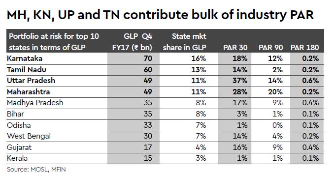 Collections stabilising in key states: Collection efficiency in Uttar Pradesh is back to 98-99% levels. Other major states like Karnataka and MP are also displaying much improved collection trends. PAR >90dpd in most troubled states, including UP, has dropped to below 15%. However, Maharashtra continues to witness significant delinquency pressures. Several companies confirmed that the next six months could remain a difficult period, particularly in Maharashtra. While our interactions with the companies suggest minimal/zero impact of farm loan waivers, we would like to observe the delinquency trends for a few more quarters.
