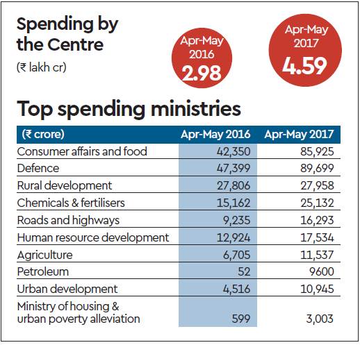 The fiscal deficit in the first two months of 2016-17 was 43% of the annual estimate, while it was 37.5% of the relevant target a year ago. Subsidies apart, the April-May period also saw a 58% y-o-y rise in capex to Rs 52,536 crore, nearly half was defence-related. Other departments which benefited from the front-loading of expenditure included agriculture, urban development, human resource development and housing, all priority area of the Naredra Modi government.