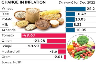Wheat prices rose by 22.2% in December 2022. Wheat output in the 2021-22 crop year (July-June), as per the agriculture ministry, has declined by around 3% on year to 106.8 million tonne (MT) because of heat waves during the flowering stage of the crop in March last year. In May, 2022, India banned wheat exports for ensuring domestic supplies