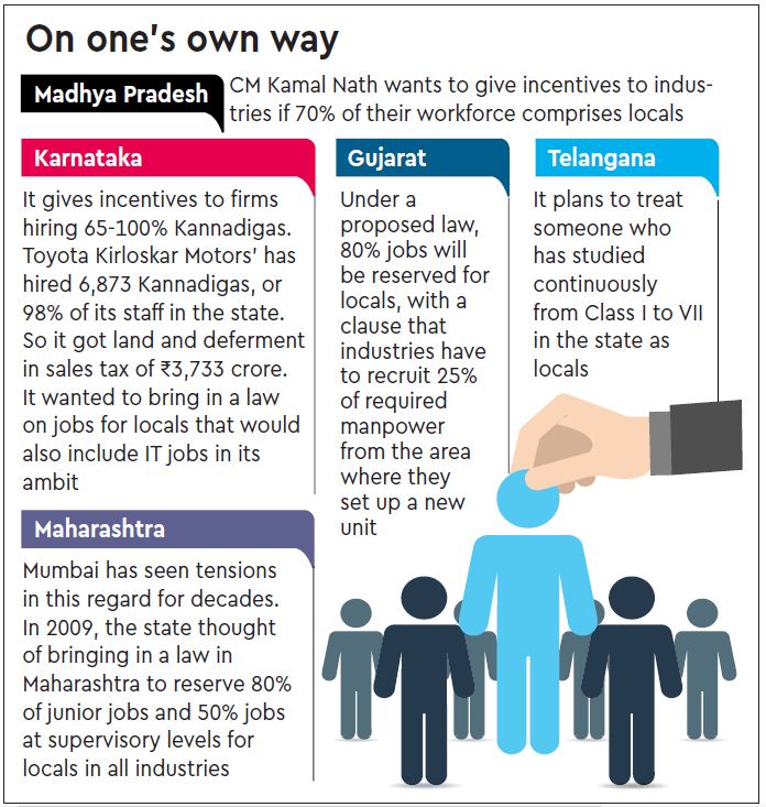 While new Madhya Pradesh chief minister Kamal Nath’s decision to give incentives to industries if 70% or more of their workforce is local people is latest in the series, many other states including Maharashtra, Karnataka, Gujarat, Himachal Pradesh, Telangana and Goa have taken a carrot-and-stick approach to promote local employment. This has revived fears of ultra-protectionism by states, which is expected to only exacerbate in the build-up to the 2019 Lok Sabha polls.