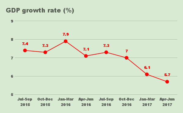 India’s GDP growth at 5.7% in the first quarter did not come as a surprise as the country was still reeling under the self-imposed noteban and massive destocking ahead of an ambitious switch to the indirect tax regime of Goods and Services Tax (GST). The scenario, however, has improved since then, and so is expected for the GDP growth — between 6.2% and 6.6% by conservative estimates. The Reuters poll of 52 economists has estimated the GDP growth at 6.4% from a year ago. If the GDP data matches estimates, it will break a five-quarter slowing trend and mark the best rate this calendar year.