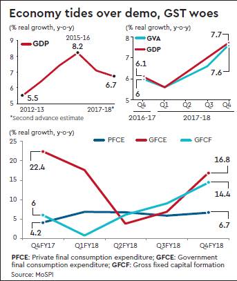 the fastest pace in seven quarters, aided by the gradual broad-basing of a recovery in private investments and a sustained push from government expenditure, especially of the consumption variety. According to data released by the Central Statistics Office (CSO) on Thursday, the Q4FY18 GDP expansion that came on a 6.1% growth in the year-ago quarter was much higher than (a revised) 7% in the previous quarter (Q3FY18).