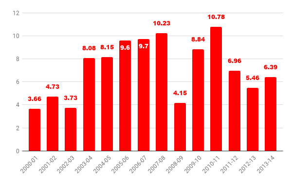 As per the calculation, India’s GDP growth was consistently over 8%, which slowed down during the financial crisis in 2008-09, and soon recovered back to 8%. The economic growth, however, fell drastically after 2010-11. The economic growths in the following years were 6.96%, 5.46, and 6.39% respectively.