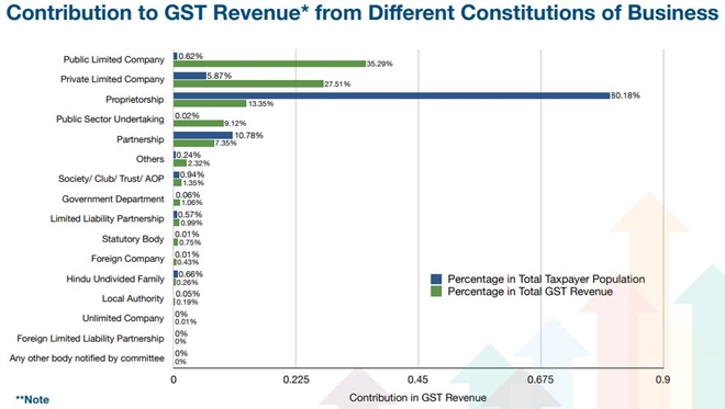 The public listed companies in India add the highest amount of Goods and Services tax revenues for the government. These companies comprise a mere 0.62 per cent of the overall taxpayer base, but they contributed 35.29 per cent of the GST revenues, revealed the statistical report of GST Network after three years of GST. On the flip side, the proprietorships with the maximum 80.18 per cent taxpayer base contributed 13.35 per cent of the revenue. The contributions of PSU companies also remained significant as they comprised only 0.02 per cent share in the taxpayer base but accounted for 9.12 per cent of the total GST revenue.