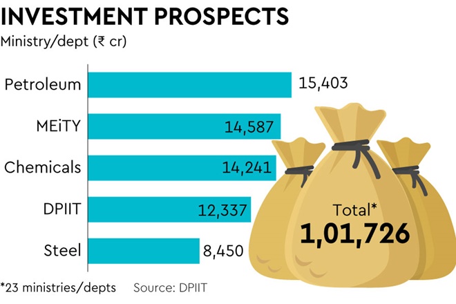 According to a DPIIT assessment, the petroleum ministry has the highest potential to draw investments (Rs 15,403 crore), followed by the ministry of electronics and IT (Rs 14,587 crore) and the chemicals and petrochemicals ministry (Rs 14,241 crore).