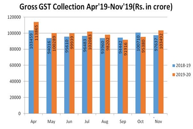 The jump in the collection came amid the government taking a slew of measures in the last few months to boost growth even as the GDP growth has continued its downward spiral for the seventh consecutive quarter, falling to 4.5 per cent in the second quarter (July-September) of FY20, according to the official data released on Friday. Similarly, the output of eight core infrastructure industries contracted by 5.8 per cent in October.
