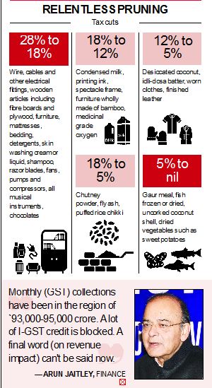 Having undergone constant administrative/structural changes and rate revisions since its July launch, it was an overhaul that awaited the goods and services tax (GST) on Friday. The GST Council has brought down the tax rates on another 178 items from 28% to 18%, leaving only 50 or just over 4% — compared with 19% initially — of the goods in the highest slab that consumers found pinching, dented consumption and fanned inflation. Essentially, the 28% slab has been restricted to sin goods (which also attract cesses), white goods, construction inputs like cement and paint, auto parts and aircraft/yacht parts while scores of mass-consumption, everyday-use items including fast-moving consumer goods will now attract GST at 18% (see chart). In addition, the rates were cut to 12% from 18% for 15 items, from 18% to 5% for six, from 12% to 5% for eight and from 5% to nil for six. These revisions along with rate cuts for about 100 goods effected previously, officials said, would pave the way for a convergence of the GST tax slabs — principally four now — to two eventually.